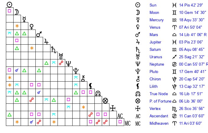 | Sun | 14 Pisces 42 | 16 Pisces 7 | 13 Cancer 11 |