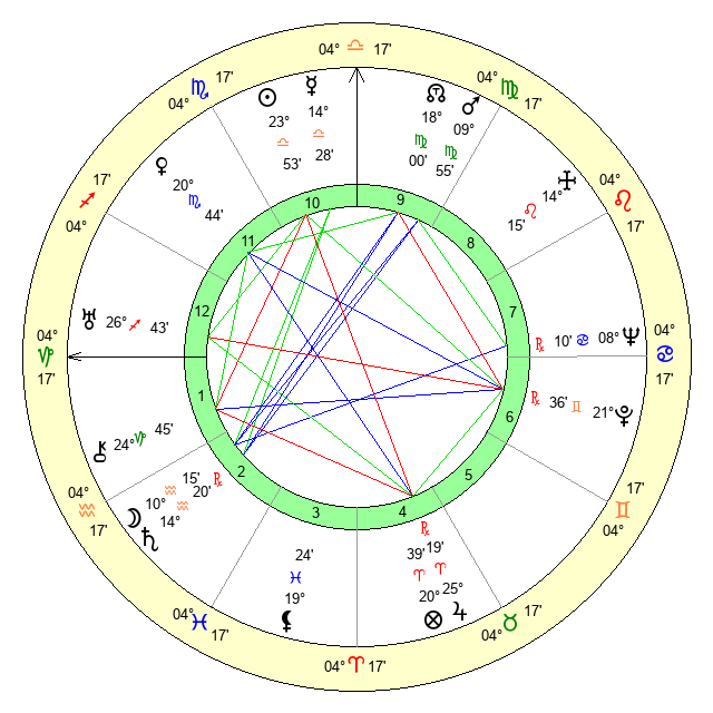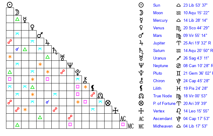 | Sun | 23 Libra 54 | 24 Libra 34 | 26 Aquarius 22 |