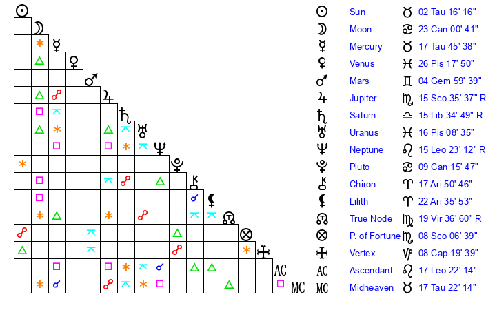 Sun | 2 Taurus 16 | 3 Taurus 33 | 10 Leo 4 |
