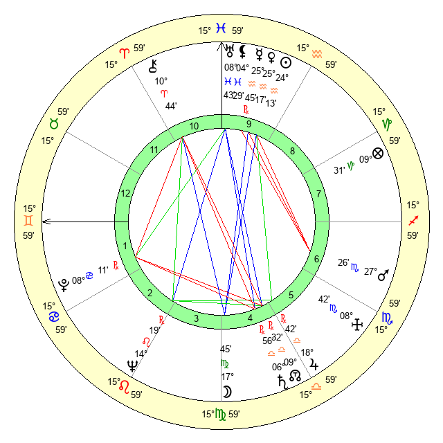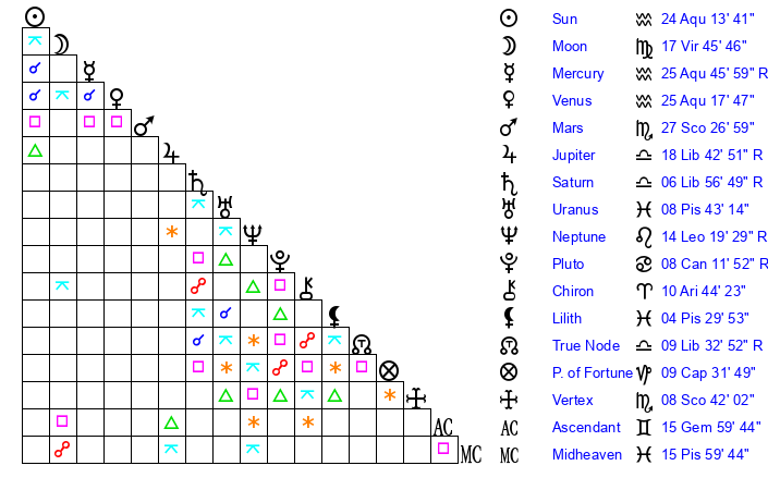 Sun | 24 Aquarius 14 | 25 Aquarius 15 | 5 Gemini 36 |