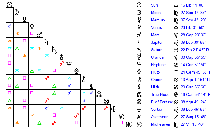 | Moon | 27 Scorpio 44 | 7 Gemini 2 | 2 Aries 3 |