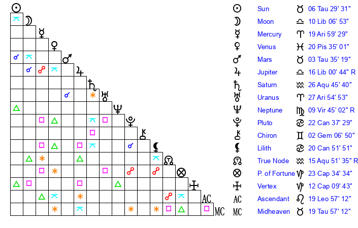 Moon | 10 Libra 6 | 2 Taurus 26 | 17 Aquarius 11 |