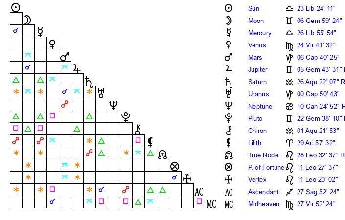| Sun | 23 Libra 24 | 24 Libra 20 | 24 Aquarius 52 |
