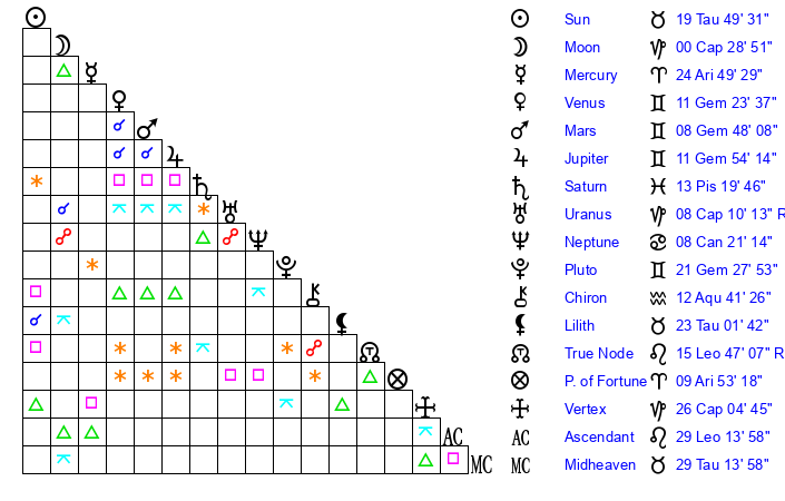 | Pluto | 21 Gemini 28 | 3 Aquarius 48 | 23 Gemini 43 |