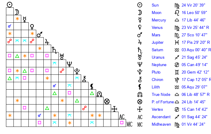 | Sun | 24 Virgo 20 | 25 Virgo 47 | 26 Capricorn 57 |