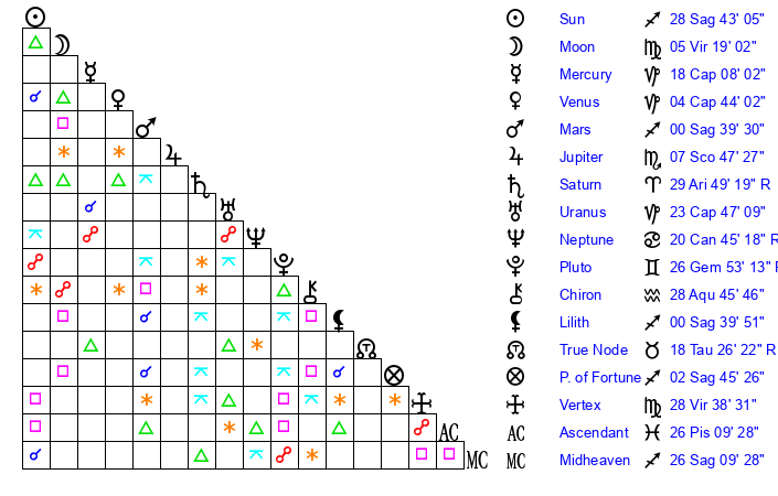 | Sun | 28 Sagittarius 43 | 0 Capricorn 4 | 23 Aries 23 |