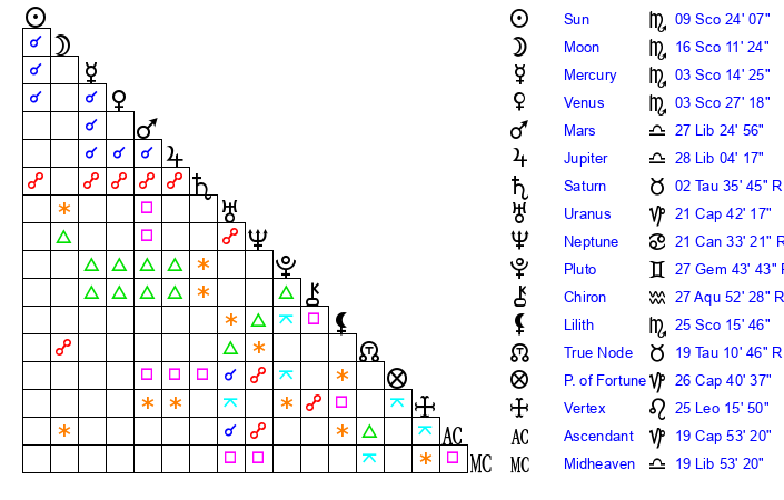 | Moon | 16 Scorpio 12 | 23 Scorpio 50 | 13 Capricorn 40 |