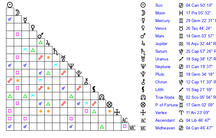 | Moon | 17 Pisces 0 | 2 Leo 50 | 0 Libra 17 |