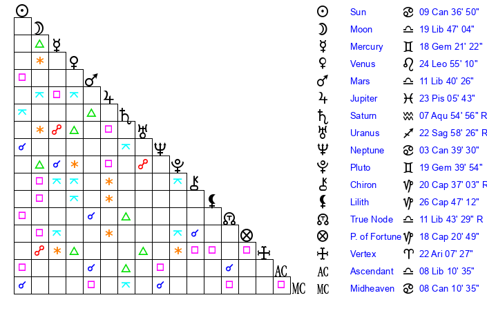 | Sun | 9 Cancer 36 | 11 Cancer 4 | 8 Scorpio 6 |