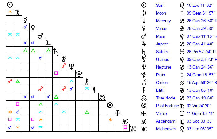 | Sun | 10 Leo 11 | 11 Leo 36 | 6 Sagittarius 20 |