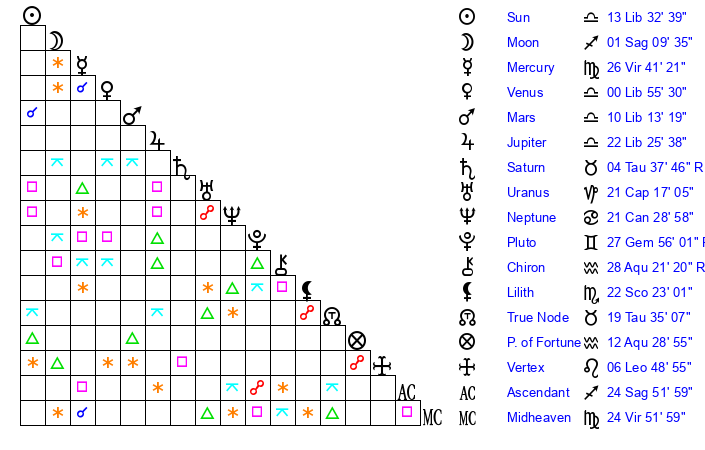 | Sun | 13 Libra 32 | 14 Libra 41 | 9 Aquarius 42 |
