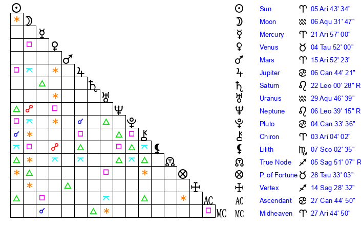 Sun | 5 Aries 44 | 7 Aries 2 | 18 Cancer 5 |