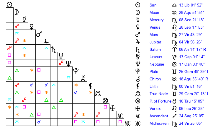 | Sun | 13 Libra 2 | 13 Libra 41 | 11 Aquarius 13 |