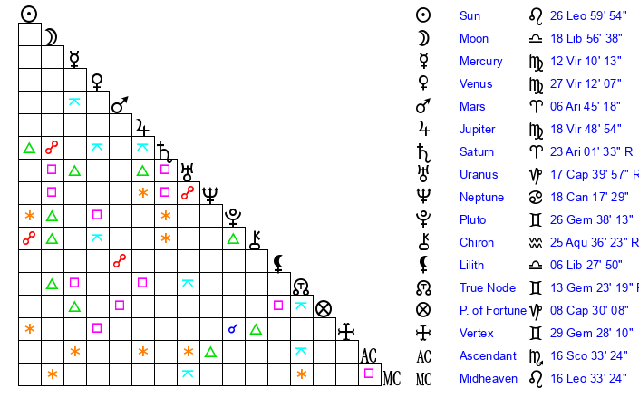 | Sun | 27 Leo 0 | 27 Leo 55 | 22 Sagittarius 6 |