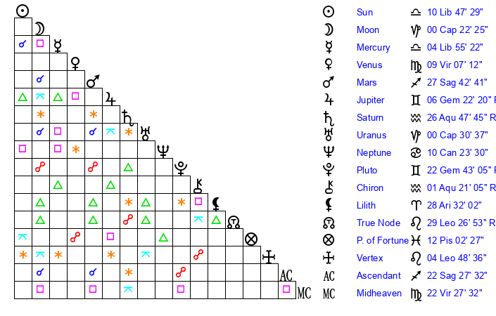 | Mercury | 4 Libra 56 | 26 Libra 58 | 28 Capricorn 45 |