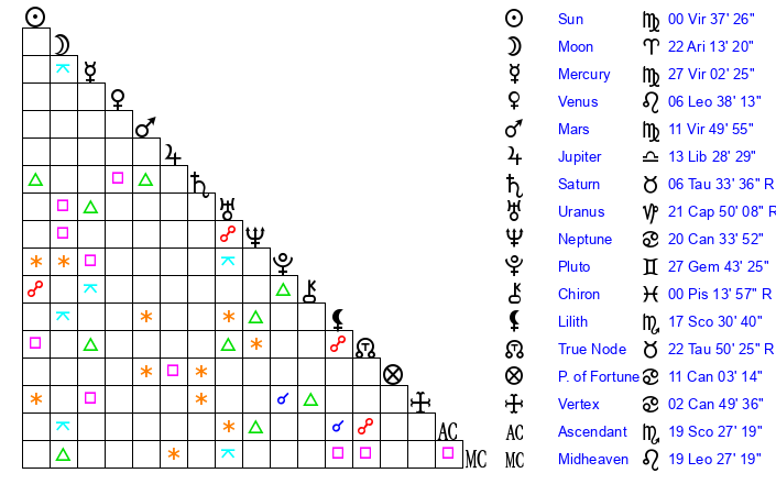 | Moon | 22 Aries 5 | 18 Virgo 54 | 12 Cancer 21 |