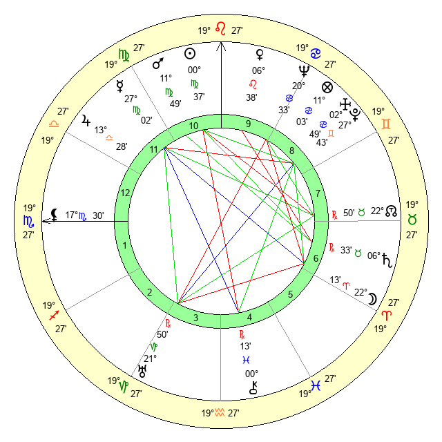 | Mercury | 27 Virgo 3 | 14 Leo 36 | 13 Capricorn 9 |