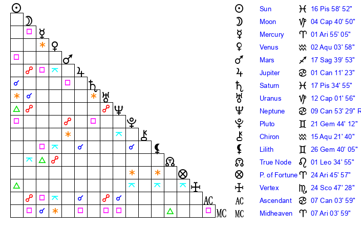 | Sun | 16 Pisces 59 | 18 Pisces 22 | 11 Cancer 33 |