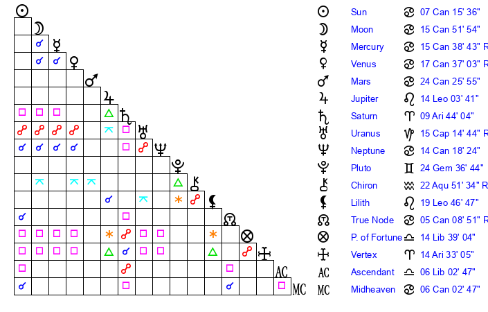 | Neptune | 14 Cancer 19 | 2 Aries 9 | 17 Cancer 7 |