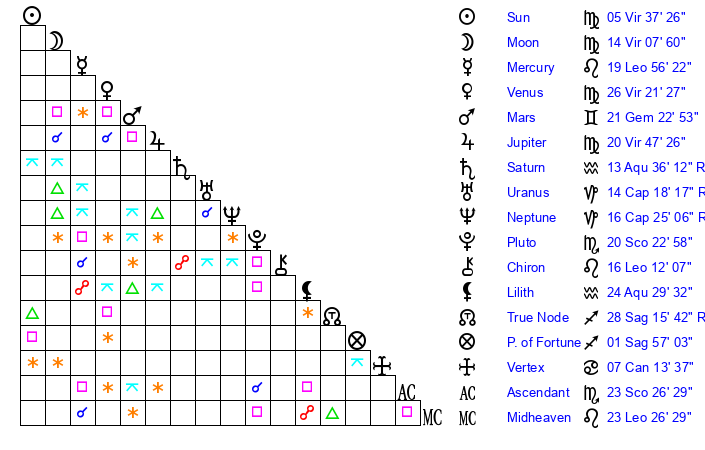 | Moon | 14 Virgo 6 | 7 Scorpio 46 | 4 Sagittarius 11 |