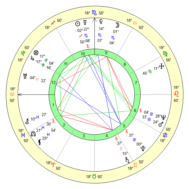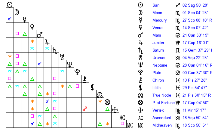 | Moon | 1 Scorpio 11 | 2 Libra 48 | 28 Scorpio 9 |