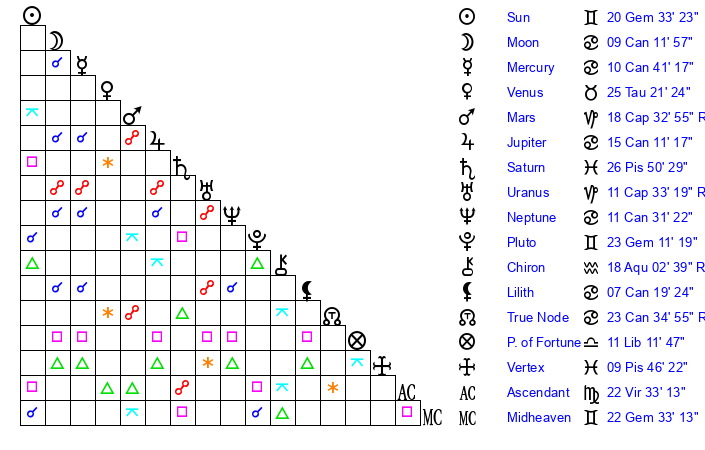 | Pluto | 23 Gemini 12 | 3 Aquarius 28 | 24 Gemini 47 |