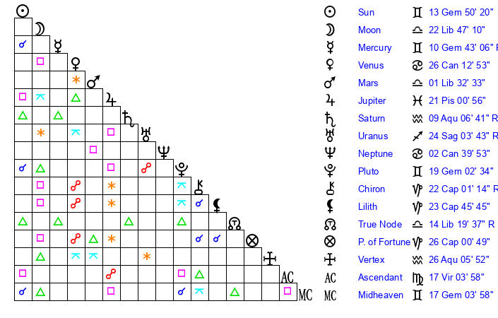 | Sun | 13 Gemini 50 | 15 Gemini 17 | 11 Libra 16 |
