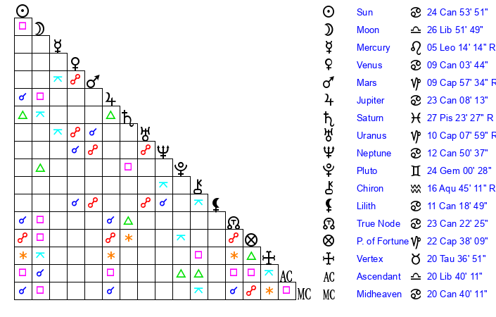 | Sun | 24 Cancer 54 | 26 Cancer 19 | 20 Scorpio 10 |