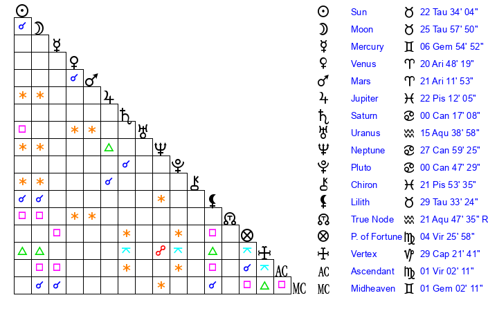 | Moon | 25 Taurus 55 | 13 Sagittarius 17 | 6 Gemini 12 |