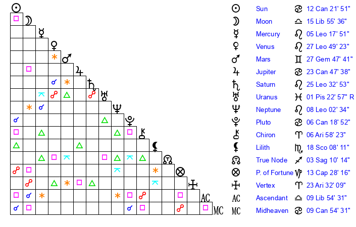 Sun | 12 Cancer 21 | 13 Cancer 41 | 25 Libra 0 |