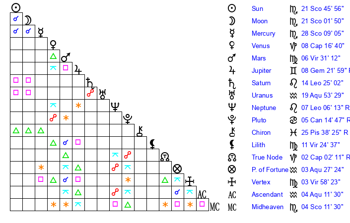| Sun | 21 Scorpio 46 | 22 Scorpio 49 | 10 Pisces 18 |