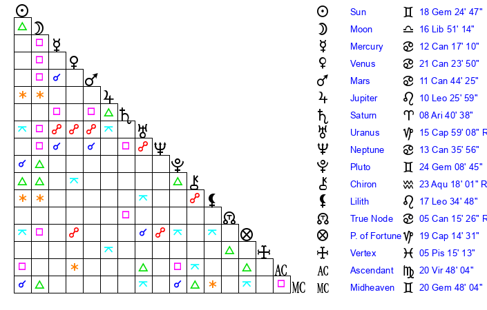 | Sun | 18 Gemini 25 | 19 Gemini 6 | 11 Libra 4 |
