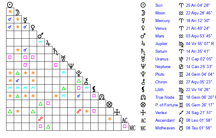 | Sun | 25 Aries 5 | 25 Aries 58 | 16 Leo 26 |