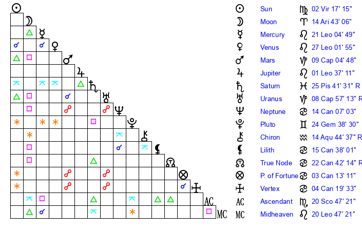 | Moon | 14 Aries 48 | 13 Libra 44 | 1 Leo 51 |