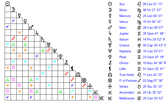 | Mercury | 25 Leo 4 | 13 Leo 53 | 15 Sagittarius 26 |