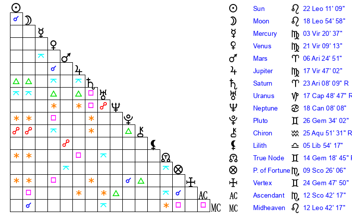 | Sun | 22 Leo 11 | 23 Leo 7 | 17 Sagittarius 1 |