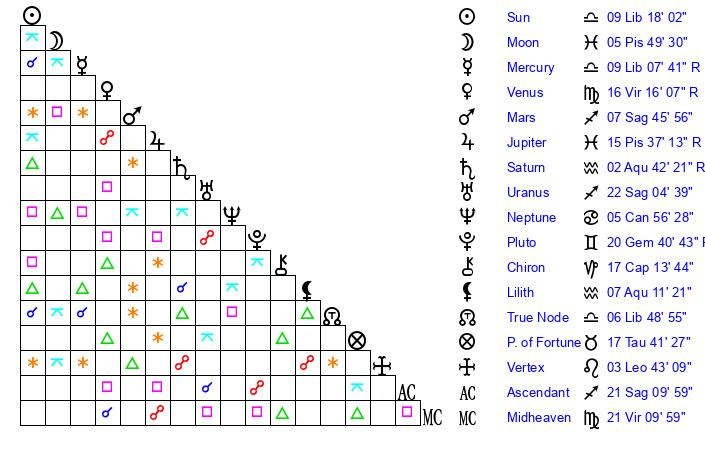 | Sun | 9 Libra 18 | 10 Libra 44 | 12 Aquarius 27 |