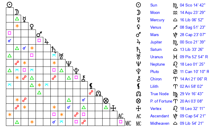 Saturn | 14 Libra 9 | 12 Pisces 54 | 20 Libra 42 |