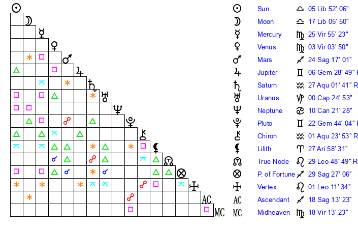 | Sun | 5 Libra 52 | 6 Libra 48 | 6 Aquarius 53 |
