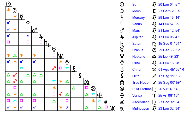 | Pluto | 26 Leo 15 | 2 Aquarius 8 | 28 Leo 13 |