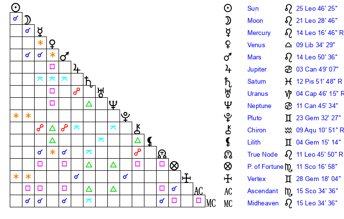 | Moon | 21 Leo 36 | 12 Cancer 33 | 6 Capricorn 50 |