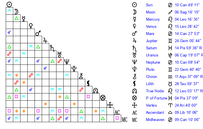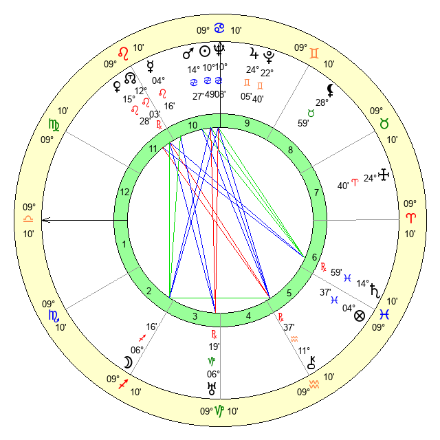 | Sun | 10 Cancer 49 | 12 Cancer 1 | 6 Scorpio 22 |