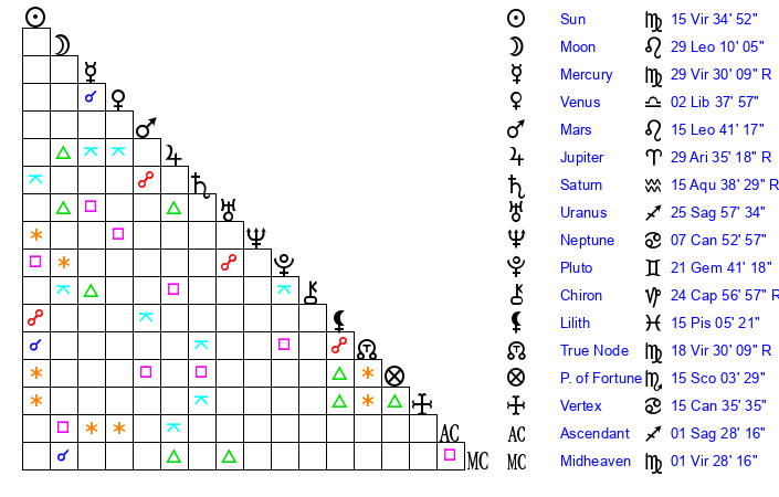 | Mercury | 29 Virgo 30 | 11 Virgo 53 | 1 Capricorn 56 |
