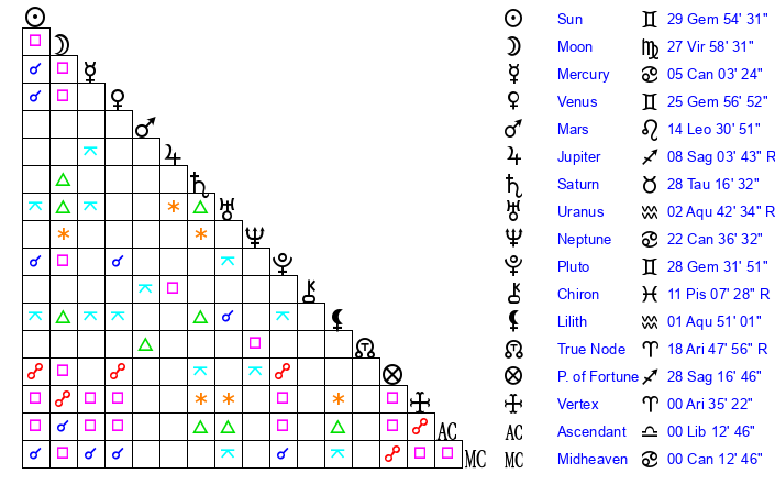 | Sun | 29 Gemini 54 | 0 Cancer 34 | 19 Libra 0 |