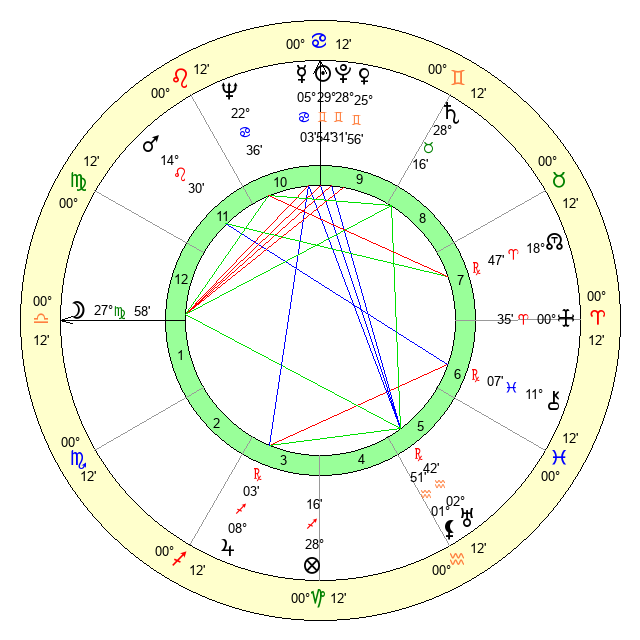 | Moon | 28 Virgo 4 | 9 Taurus 9 | 16 Scorpio 32 |