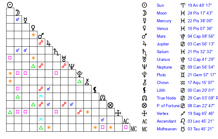 | Sun | 19 Aries 40 | 21 Aries 4 | 13 Leo 4 |