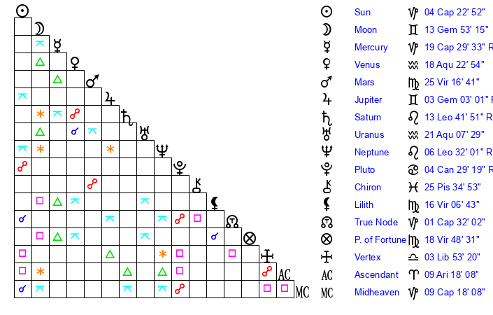Moon | 13 Gemini 51 | 16 Scorpio 19 | 13 Taurus 15 |