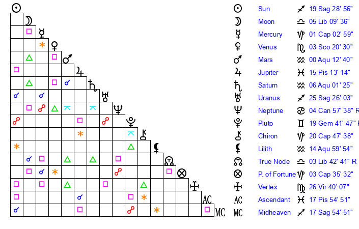 | Pluto | 19 Gemini 42 | 0 Aquarius 30 | 18 Gemini 58 |