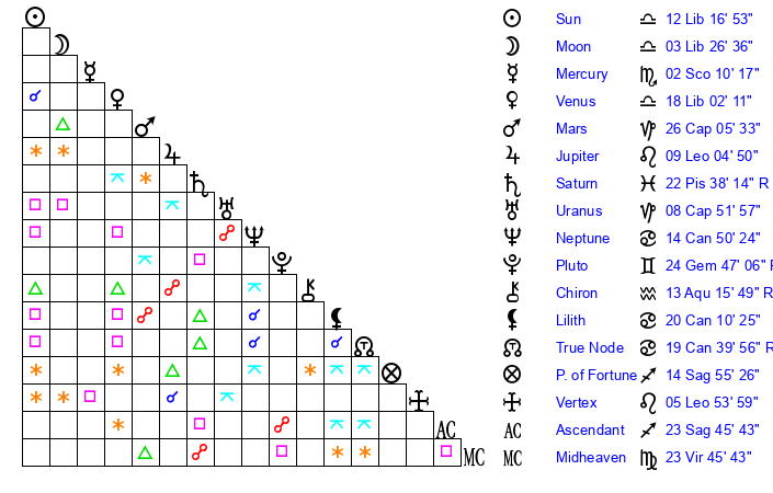 | Venus | 18 Libra 3 | 21 Virgo 6 | 14 Pisces 54 |