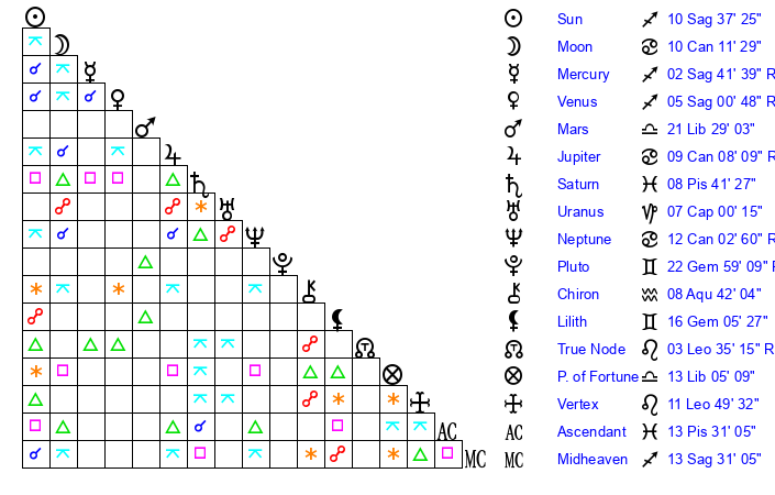 | Sun | 10 Sagittarius 38 | 12 Sagittarius 1 | 9 Aries 49 |